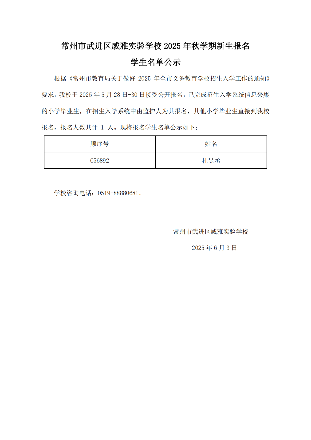 常州市武进区威雅实验学校2025年秋学期新生报名学生名单公示