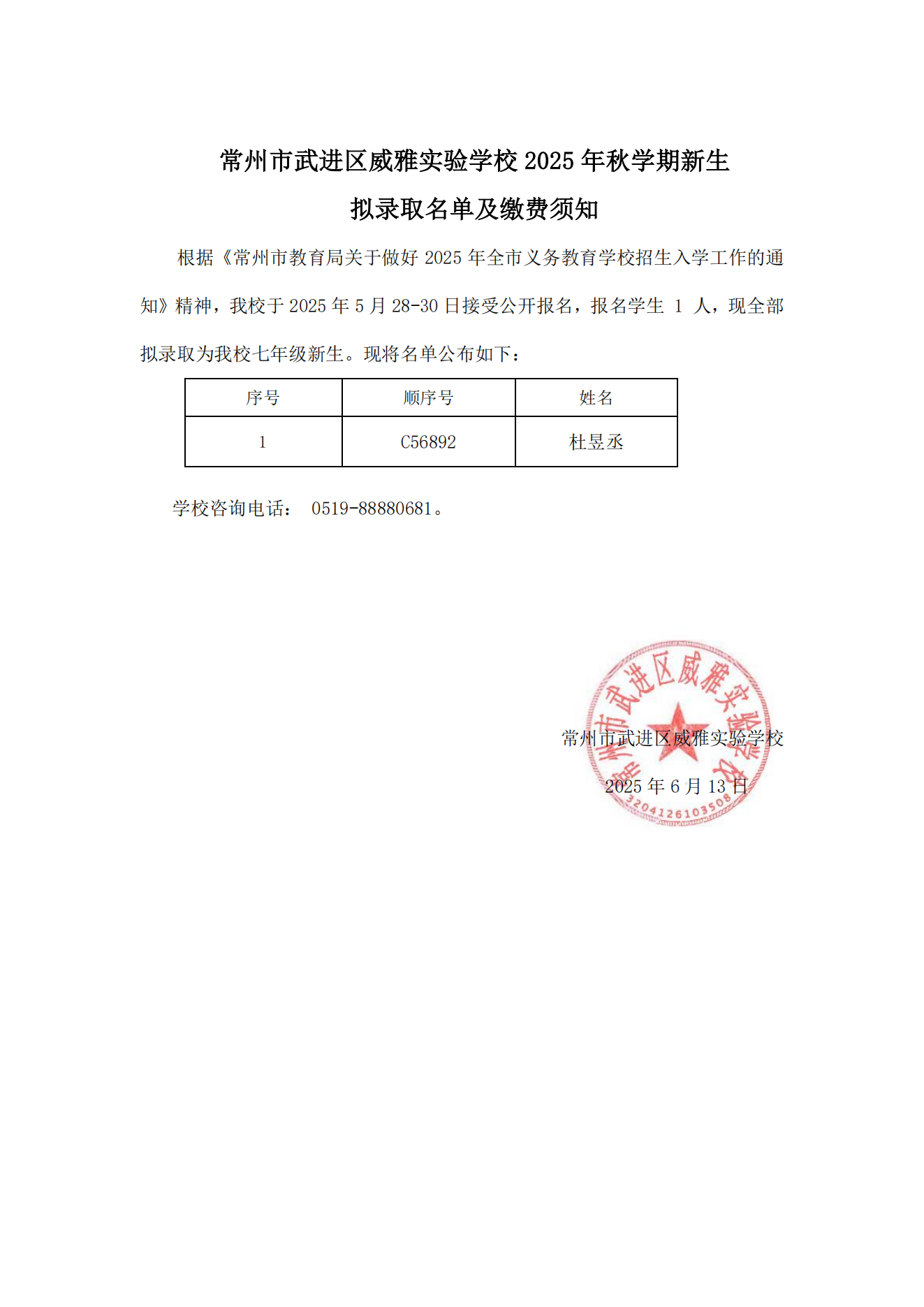 常州市武进区威雅实验学校2025年秋学期新生拟录取名单及缴费须知