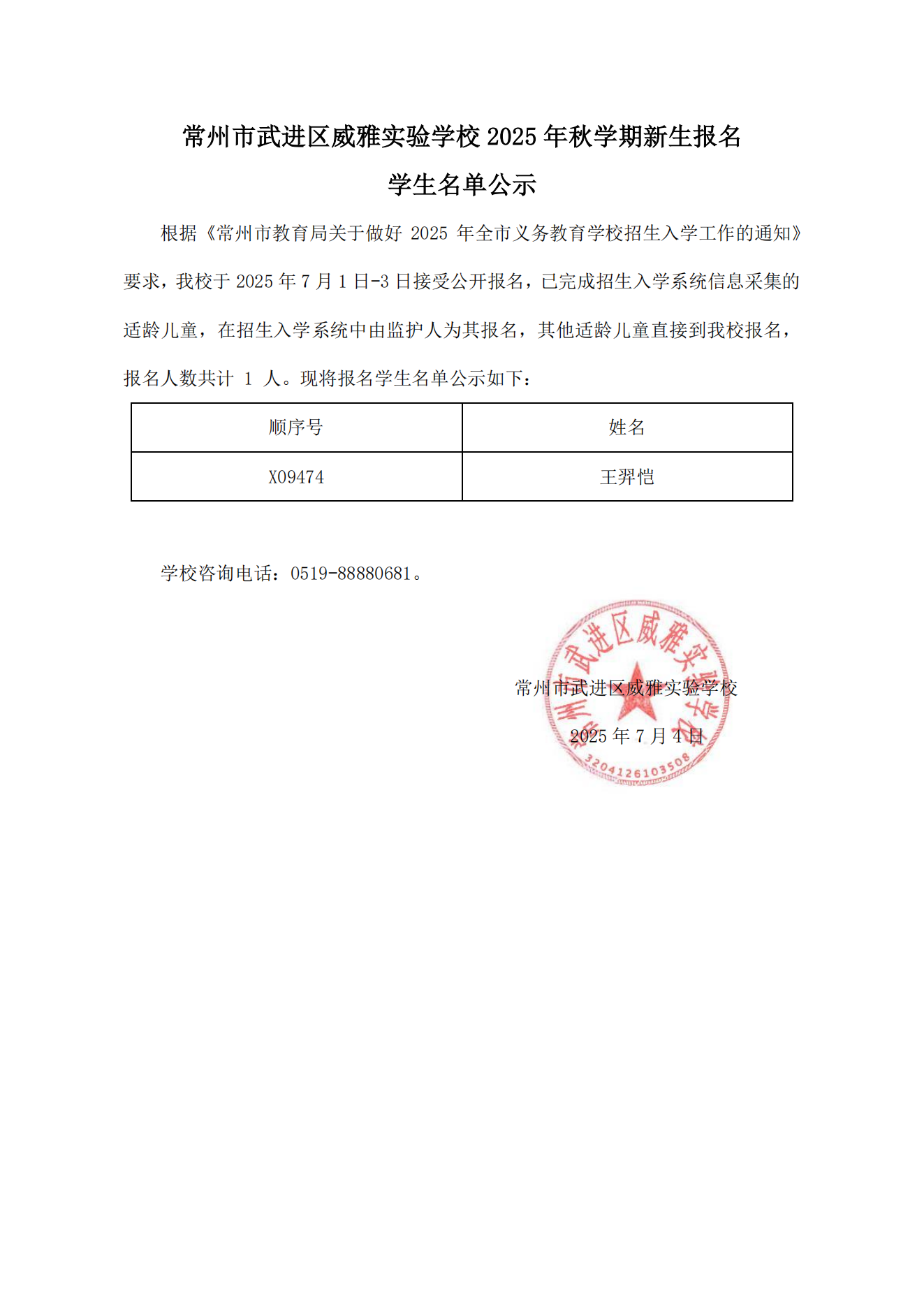 常州市武进区威雅实验学校2025秋学期新生报名学生名单公示